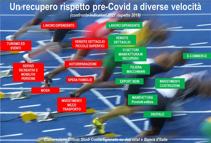 I settori up e down – A fronte del traino dell’edilizia, dei settori dell’economia digitale e dell’e-commerce, recuperano i livelli pre crisi l’export e 13 settori manifatturieri, mentre persistono gravi ritardi per la moda, i servizi per la mobilità delle persone e legati al turismo: nei tre mesi estivi del 2021, la spesa dei viaggiatori stranieri in Italia rimane del 43,2% inferiore allo stesso periodo del 2019.