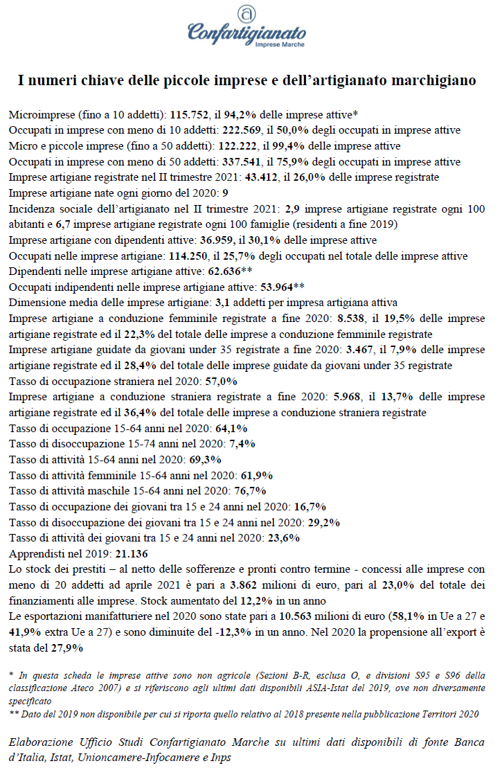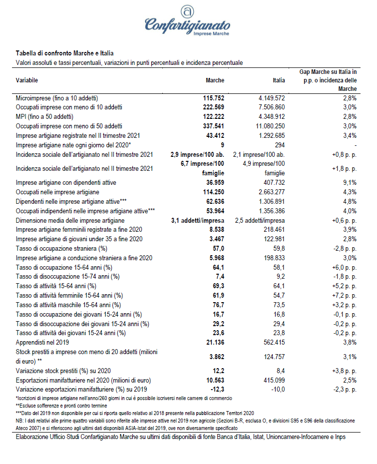Dopo 18 mesi di gravi difficoltà l'economia mostra i primi reali e significativi segnali di ripartenza. Il focus realizzato dall'Ufficio Studi di Confartigianato Marche, in collaborazione con l'Ufficio Studi nazionale, ci consegna una "fotografia" in cui ci sono ancora molti segnali negativi lasciati dalla pandemia sul nostro tessuto produttivo. Ma sono altrettanto evidenti la forza, la capacità di reagire, il coraggio manifestati dall'artigianato e dalle micro e piccole imprese marchigiane.