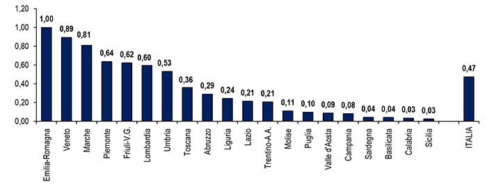 L’esposizione dei territori sul mercato russo – La regione con la maggiore esposizione sul mercato russo – valutata con l’incidenza percentuale delle esportazioni manifatturiere sul valore aggiunto del territorio – è l’Emilia-Romagna con l’1,00%, seguita da Veneto con 0,89%, Marche con 0,81% Piemonte con 0,64%, Friuli Venezia Giulia con 0,62% e Lombardia con 0,60%