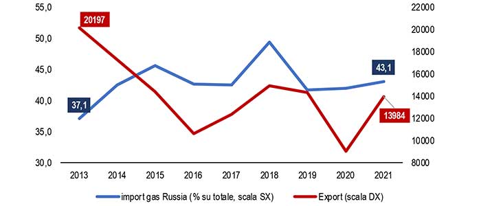 QUOTA VALORE GAS IMPORTATO IN ITALIA DALLA RUSSIA E MADE IN ITALY IN RUSSIA: 2013-2021