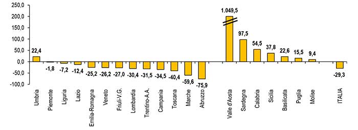 Tra le prime venti province presenti sul mercato russo, per sette di queste tra 2013 e 2021 le esportazioni verso la Russia sono più che dimezzate: per Chieti, dove segnano un -81,4%, Fermo con -70,3%, Mantova con -61,3%, Varese e Rimini con -59,7% e Como con -54,4%.