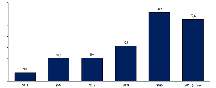 Boom per e-commerce – La digitalizzazione ha permesso negli ultimi anni di sostenere il boom dell’e-commerce, che nel 2020 ha registrato una ulteriore accelerazione a seguito del crollo delle vendite nei canali distributivi tradizionali conseguente alla pandemia: le vendite online nei primi cinque mesi del 2021 crescono del 27,8% su base annua e superano del 60,9% il livello registrato nello stesso periodo del 2019.