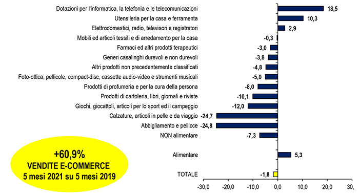 L’esame dei dati sul commercio al dettaglio evidenzia che Nei primi cinque mesi del 2021 le vendite per l’informatica, la telefonia e le telecomunicazioni superano del 18,5% il livello dello stesso periodo del 2019, tipologia merceologica che con utensileria per la casa e ferramenta (+10,3%) ed elettrodomestici, radio, registratori e televisori (+2,9%) sono i comparti no food a superare i livelli pre-crisi. Nel complesso le vendite al dettaglio totali sono sotto dell’1,8% e quelle non alimentari registrano un calo del 7,3%, appesantite dalla caduta del 24,8% registrato dai prodotti della moda.