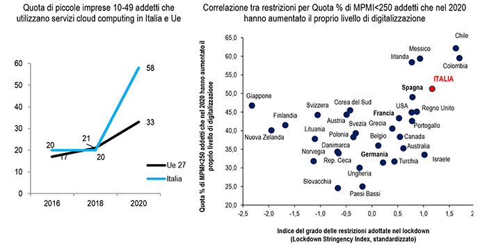 Una conferma della crescente propensione alla digitalizzazione delle imprese di minore dimensione proviene dal rapporto dell’Ocse SME and Entrepreneurship Outlook 2021 pubblicato nei giorni scorsi, in cui si evidenzia la stretta correlazione tra il grado di restrizione per limitare l’estendersi della pandemia da Covid-19 e l’aumento del livello di digitalizzazione delle imprese. In particolare l’Italia presenta, tra i paesi dell’Unione europea, la più alta quota di micro, piccole e medie imprese (MPMI) che nel 2020 ha aumentato il proprio livello di digitalizzazione: nel dettaglio l’Italia presenta la più elevata intensità delle restrizioni e in parallelo presenta più della metà (51,2%) delle MPMI che ha aumentato il grado di digitalizzazione, davanti alla Spagna (49,0%), alla Francia (43,4%) e alla Germania (31,4%).