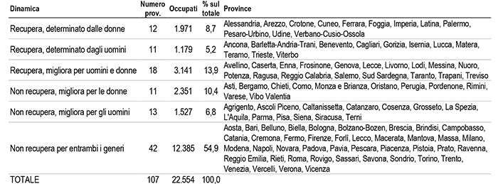 Un analisi per genere mostra che in 18 province, rappresentative del 13,9% dell’occupazione nazionale, si registra un aumento del tasso di occupazione per entrambi in generi; in altre 10 province, che comprendono il 7,1% degli occupati, sale solo il tasso di occupazione femminile mentre per le rimanenti 10 province, rappresentative del 4,7% dell’occupazione, sale solo il tasso di occupazione maschile.