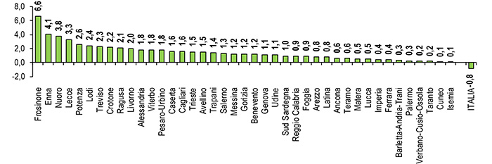 In 41 province, in cui si addensa il 27,9% dell’occupazione italiana, si osserva nel 2021 un completo recupero del tasso di occupazione del 2019, in controtendenza rispetto al calo in media nazionale, ed i dieci aumenti più intensi sono quelli di Frosinone (+6,6 punti percentuali), Enna (+4,1 punti), Nuoro (+3,8 punti), Lecce (+3,3 punti), Potenza (+2,6 punti), Lodi (+2,4 punti), Treviso (+2,3 punti), Crotone (+2,2 punti), Ragusa (+2,1 punti) e Livorno (+2,0 punti).