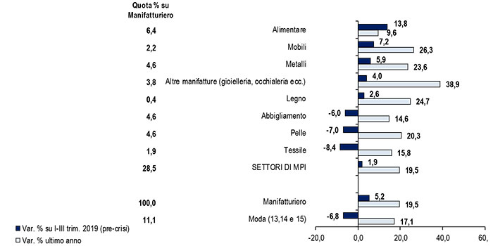 Nei primi tre trimestri del 2021 mentre le vendite all’estero del manifatturiero crescono del +5,2% rispetto ai livelli pre-Covid-19, anche il made in Italy nei settori di MPI – alimentari, moda, mobili, legno, metalli e altre manifatture torna in territorio positivo (+1,9%), migliorando la ‘crescita zero’ del primo semestre dell’anno. Dopo il pesante calo nel 2020, nel corso del 2021 le vendite all’estero nei settori in esame risalgono del +19,5%, consolidando su base annua un valore di 135,9 miliardi di euro, pari al 7,8% del PIL, il massimo storico dal 1995.
