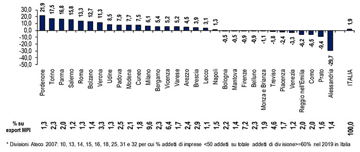DINAMICA EXPORT SETTORI MPI 2021 RISPETTO PRE-PANDEMIA NELLE PRINCIPALI PROVINCE