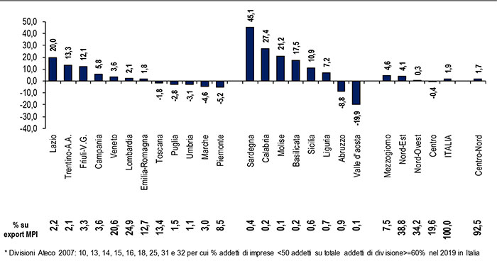DINAMICA EXPORT SETTORI MPI 2021 RISPETTO PRE-PANDEMIA PER REGIONE