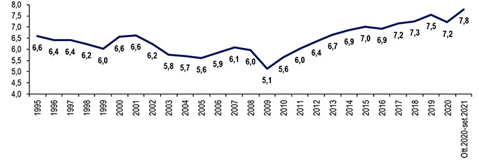 Anni 1995-2020 e 12 mesi ottobre 2020-settembre 2021. % su PIL – Elaborazione Ufficio Studi Confartigianato su dati Istat