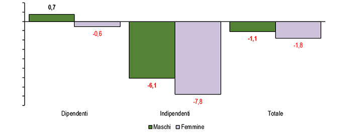 L’analisi per genere, disponibile su dati trimestrali, evidenzia che ne terzo trimestre 2021 l’occupazione indipendente femminile scende del 7,8% rispetto allo stesso periodo del 2019, a fronte del calo del 6,1% della componente maschile.