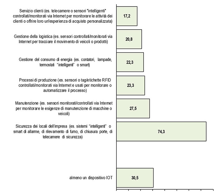 Le tecnologie Iot – Tra le piccole imprese che hanno fatto ricorso a Internet delle cose risulta più diffuso l’utilizzo di dispositivi per la sicurezza dei locali dell’impresa come, ad esempio, sistemi intelligenti o smart di allarme (74,3%), per la manutenzione di macchine o veicoli attraverso sensori monitorati o controllati via Internet (27,5%), per i processi di produzione, come sensori o etichette RFID controllati via Internet e usati per monitorare o automatizzare il processo (23,3%), per la gestione del consumo di energia mediante contatori, lampade, termostati “intelligenti” o smart (22,3%), per la gestione della logistica mediante sensori controllati/monitorati via Internet per tracciare il movimento di veicoli o prodotti (20,8%), per l’offerta di servizi ai clienti, ad esempio, mediante telecamere o sensori “intelligenti” connessi per monitorare le attività della clientela o offrire loro un’esperienza di acquisto personalizzata (17,2%).
