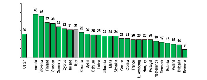 Per quanto riguarda l’Internet delle cose (Iot, acronimo di Internet of things), relativo a all’interconnessione di singoli dispositivi o sistemi di dispositivi che raccolgono e scambiano dati e che possono essere monitorati o controllati via Internet, il 31% delle piccole imprese nel 2021 utilizza questa tipologia di dispositivi Iot, cinque punti sopra al 26% della media Ue a 27. La diffusione di tecnologie Internet of things tra le piccole imprese in Italia è di poco inferiore a quella rilevata in Germania (34%), mentre risulta ampiamente superiore a quella delle omologhe in Spagna (26%) e in Francia (20%).