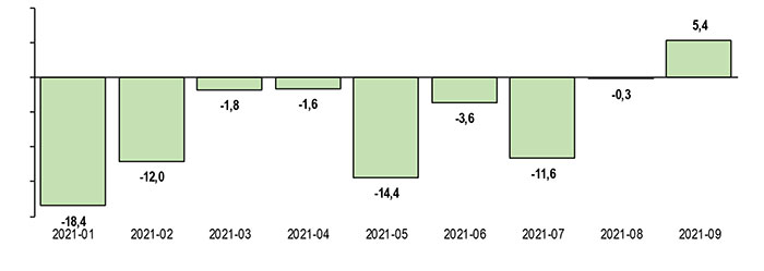 Recuperano le esportazioni, che nei primi nove mesi del 2021 superano del 5,8% il corrispondente livello del 2019, sovraperformando la crescita dell’1,5% dell’export tedesco, mentre la Francia rimane in territorio negativo (-5,4%).