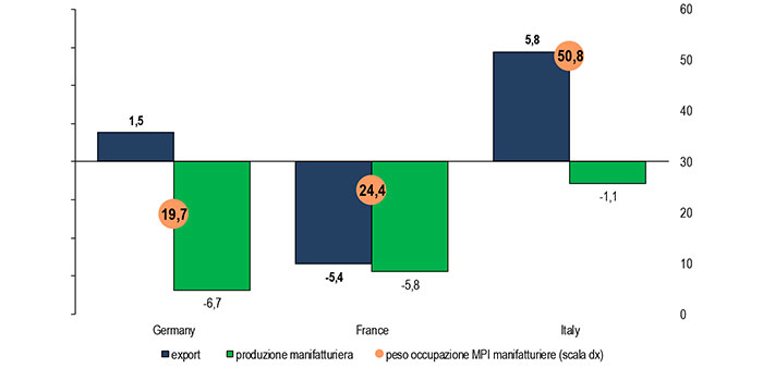PRODUZIONE MANIFATTURA ED EXPORT VS PRE-COVID-19 E PESO OCCUPAZIONE MPI NEI PRINCIPALI PAESI UE