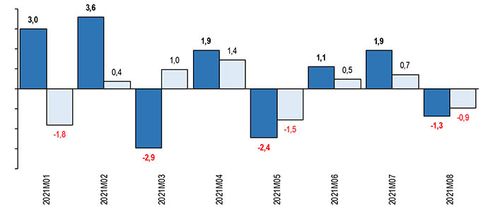 La ripresa non è completamente diffusa: segna un ritardo la produzione di autoveicoli (-8,5%) mentre è ancora profonda la crisi della moda, con tessile a -11,1%, pelle a -22,4% e l’abbigliamento a -35,7%, un livello di produzione inferiore di oltre un terzo di quanto realizzato prima della pandemia. In questo settore chiave del made in Italy Nel corso di quest’anno si colgono timidi segnali di reazione, con la produzione del comparto moda che ad agosto 2021, al netto della stagionalità, è del 4,7% superiore ai livelli di fine 2020, registrando un aumento congiunturale della produzione in cinque degli otto mesi dell’anno.