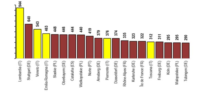 I territori del made in Italy: un confronto europeo – L’analisi condotta su 232 regioni europee (classificazione Nuts 2) vede 5 regioni italiane nelle prime 20 posizioni per occupazione manifatturiera. Al primo posto troviamo la Lombardia con 944 mila occupati, seguita da Stoccarda con 640 mila, Veneto con 543 mila ed Emilia-Romagna con 463 mila. Seguono, all’11° posto il Piemonte con 376 mila occupati e al 16° posto la Toscana con 312 mila.