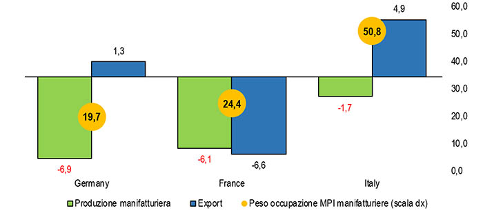 PRODUZIONE MANIFATTURA ED EXPORT VS PRE-COVID-19 E PESO MPI NEI PRINCIPALI PAESI UE