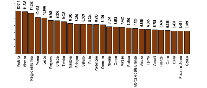 In otto province il valore aggiunto manifatturiero pro capite supera il doppio della media nazionale: Modena con 12.014 euro per abitante, Vicenza con 11.833 euro per abitante Reggio nell’Emilia con 11.352 euro per abitante, Parma con 10.135 euro per abitante, Lecco con 10.076 euro per abitante, Bergamo con 9.366 euro per abitante, Brescia con 9.256 euro per abitante e Treviso con 9.035 euro per abitante.