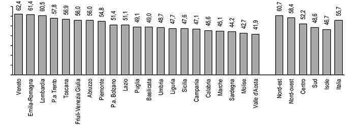 Il confronto regionale – disponibile su dati relativi al totale delle imprese – evidenzia che la maggiore presenza di imprese innovative si registra in Veneto con il 62,4%, seguito – con valori sopra alla media nazionale – da Emilia-Romagna con 61,4%, Lombardia con 60,5%, Provincia Autonoma Trento con 57,8%, Toscana con 56,9%, Friuli-Venezia Giulia e Abruzzo con 56,0%.