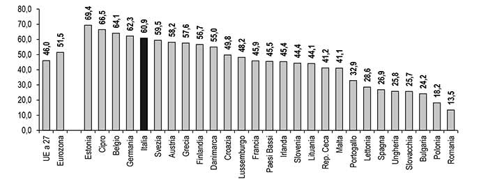 Il confronto europeo sull’innovazione delle piccole imprese – disponibile per un aggregato settoriale complessivo leggermente diverso da quello considerato nell’indagine nazionale – evidenzia che l’Italia è quinta nell’Unione europea a 27, con una quota di piccole imprese con attività innovative pari al 60,9%, superiore di 14,9 punti percentuali alla media europea (46,0%), poco distante dalla Germania (62,3%) e ampiamente superiore a quelli di Francia (45,9%) e Spagna (26,9%).
