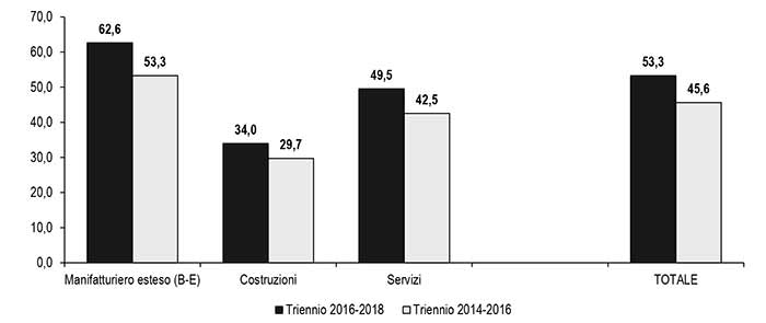 La propensione all’attività innovativa delle piccole imprese è diffusa e crescente nel tempo. Secondo l’ultima rilevazione dell’Istat relativa al triennio 2016-2018, le piccole imprese innovative sono oltre la metà (53,3%) delle piccole imprese tra 10-49 addetti, quota in crescita di 7,7 punti percentuali rispetto al 45,6% del precedente triennio, variazione leggermente più accentuata dei +7 punti percentuali del totale delle imprese. In particolare, la quota delle piccole imprese tocca il massimo del 62,6% per il manifatturiero esteso, quasi dieci punti superiore al 53,3% del triennio precedente.