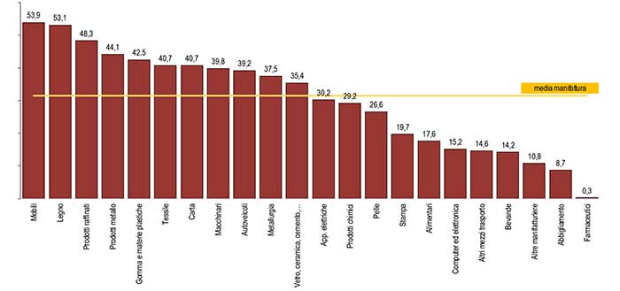 Nel complesso di manifattura ed edilizia sono esposte allo shock dei prezzi 653 mila micro e piccole imprese con 2 milioni e 182 mila addetti; di queste sono 442 mila le imprese artigiane con 1 milione e 100 mila addetti.