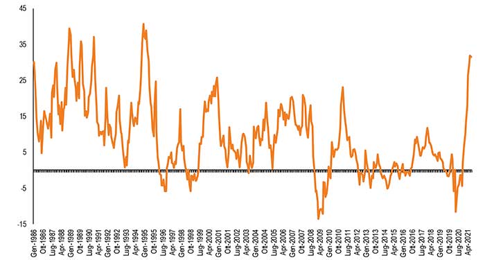 Gennaio 1986-agosto 2021, dati grezzi, saldo – Elaborazione Ufficio Studi Confartigianato su dati Istat