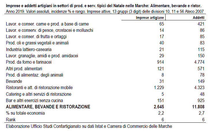L’artigianato nei settori che producono regali natalizi – La spesa di dicembre legata alle festività è intercettabile da 304.824 imprese artigiane attive in 47 settori in cui si realizzano prodotti e servizi oggetto di regalo per Natale, pari al 30,6% dell’artigianato italiano, e che danno lavoro a 907.358 addetti, pari ad un terzo (34,8%) degli addetti dell’artigianato italiano. In particolare, 147.248 imprese con 526.327 addetti fanno parte dell’artigianato artistico, quasi la metà (48,3%) ed il 58,0% rispettivamente delle imprese e degli addetti dei settori in esame. Nelle Marche sono 12.711 imprese artigiane con 47.717 addetti.