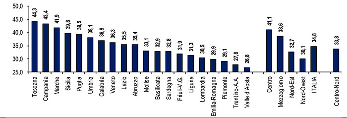 In chiave territoriale, oltre un miliardo di euro di spesa si rileva in Lombardia (3.881 milioni), Lazio (2.351 milioni), Veneto (1.919 milioni), Campania (1.857 milioni), Emilia–Romagna (1.849 milioni), Sicilia (1.741 milioni), Piemonte (1.721 milioni), Toscana (1.468 milioni) e Puglia (1.363 milioni), oltre alle province di Roma (1.768 milioni) e Milano (1.355 milioni).