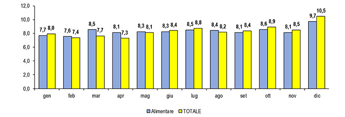 Le festività legate al Natale sono il momento dell’anno in cui si rileva la quota mensile di spesa delle famiglie più elevata dell’anno. Nella media dell’ultimo triennio, a dicembre si registra un valore delle vendite al dettaglio superiore del 25,1% rispetto alla media mensile annua, combinazione di un +16,4% nel caso dei prodotti alimentari e di un +31,5% per quelli non alimentari. Le vendite al dettaglio del mese di dicembre rappresentano il 10,4% delle totale annuo, dato composto da una quota del 9,7% per la spesa alimentare che sale all’11,0% per la vendite non alimentari.