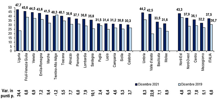 A livello territoriale, le regioni con le più alte quote di entrate totali di lavoratori difficili da reperire a dicembre 2021 sono la Liguria con il 47,7%, il Friuli-Venezia Giulia con il 45,6%, il Veneto con il 44,5%, l’Emilia Romagna con il 43,6% e le Marche con il 41,5%. La Liguria registra il maggiore aumento di tale quota, con 24,4 punti percentuali in più rispetto a dicembre 2019, seguita, con crescita a doppia cifra, dalla Valle d’Aosta con 22,8 punti in più e dalla Sardegna con 10,1 punti in più.
