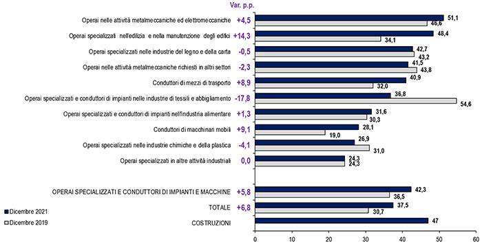 Con la ripresa della domanda di lavoro, sale la difficoltà di reperimento del personale specializzato. L’analisi dei dati del sistema Excelsior di Unioncamere-Anpal evidenzia che a dicembre 2021 le imprese segnalano che è difficile da reperire il 42,3% delle entrate previste di operai specializzati e conduttori di impianti e macchine, valore che supera di 4,8 punti percentuali il 37,5% della media del totale delle entrate.