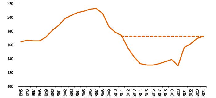 La ripresa è trainata dagli investimenti che nel biennio 2021-22 cumulano una crescita del 22%, con una maggiore accentuazione per gli investimenti in costruzioni che salgono nel biennio del 24,5%, combinazione di un aumento del 20,6% nel 2021 e del 3,2% nel 2022. Con il consolidamento della crescita nel biennio successivo (+4,9% nel 2023 e dell’1,7% nel 2024), nel 2024 gli investimenti in costruzioni recupereranno i livelli del 2011, precedenti allo scoppio della crisi del debito sovrano.