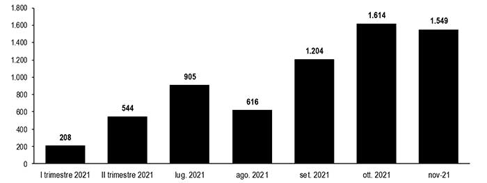 I e II trimestre del 2021 e mesi da luglio a novembre 2021. Milioni di euro – Elaborazione Ufficio Studi Confartigianato su dati Enea, Mite e Corte dei conti
