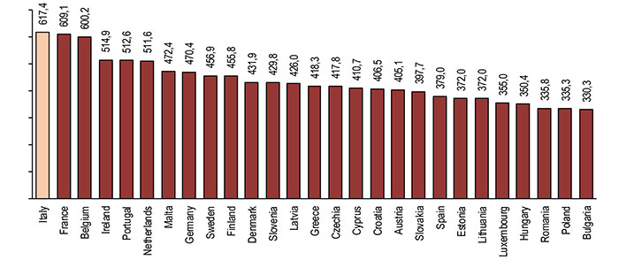 19 luglio 2021, euro per 1.000 litri – Elaborazione Ufficio Studi Confartigianato su dati Istat