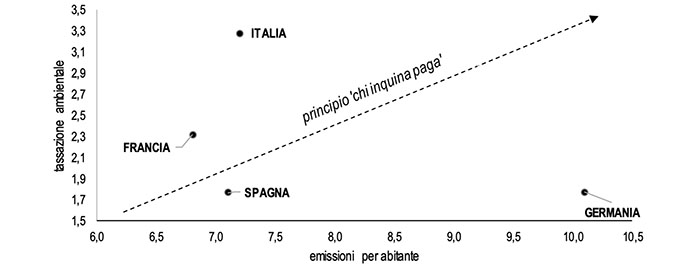 Attualmente il prelievo finalizzato alla tutela dell’ambiente non sembra rispettare in modo rigoroso il principio ‘chi inquina paga’, al centro della legislazione ambientale dell’Unione europea. L’Italia è al 5° posto nell’Unione europea a 27 per prelievo fiscale ambientale, mentre scende al 18° posto per intensità di emissioni di CO2. Nel confronto tra le due maggiori economie manifatturiere europee, l’Italia registra emissioni per abitante del 28,7% inferiore a quella della Germania a fronte di una tassazione ambientale superiore dell’85,3% (3,3 punti di PIL a fronte di 1,8 punti della Germania). Nel confronto con la Francia, il divario di emissioni è contenuto (+5,9% per l’Italia) ma si associa ad una maggiore tassazione ambientale pari ad un punto di PIL.