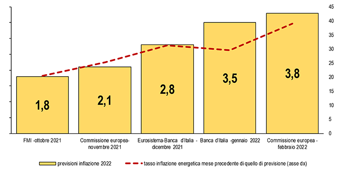 ‘Inflazione’ delle previsioni di inflazione – In salita le previsioni del tasso di inflazione 2022 che lo scorso novembre la Commissione europea stimava al +2,1%, mentre va verso il raddoppio nelle previsioni di febbraio (+3,8%). Da ottobre 2021 a febbraio 2022 si evidenzia una tendenza alla crescita delle previsioni di inflazione delle organizzazioni nazionali e internazionali.