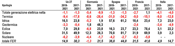 Nel confronto internazionale sulla generazione elettrica per fonte, disponibile con dati fino a agosto 2021, evidenzia che lo spunto positivo delle rinnovabili rispetto al pre-pandemia in Italia (+3,9%) rimane più debole rispetto a quello della Francia (21,5%) e della Spagna (+36,8%), mentre la Germania, in controtendenza, si osserva una riduzione dell’1,3% della produzione da rinnovabili.