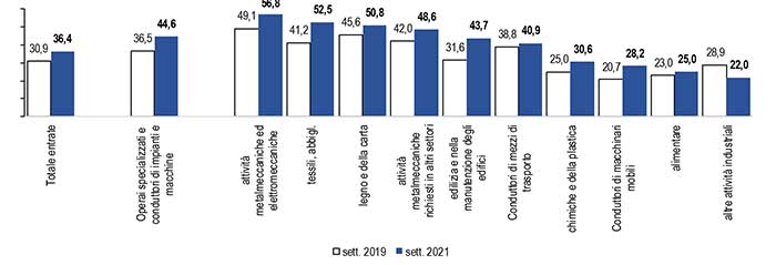 Settembre 2021 e 2019, % sul totale entrate – Elaborazione Ufficio Studi Confartigianato su dati Unioncamere-Anpal