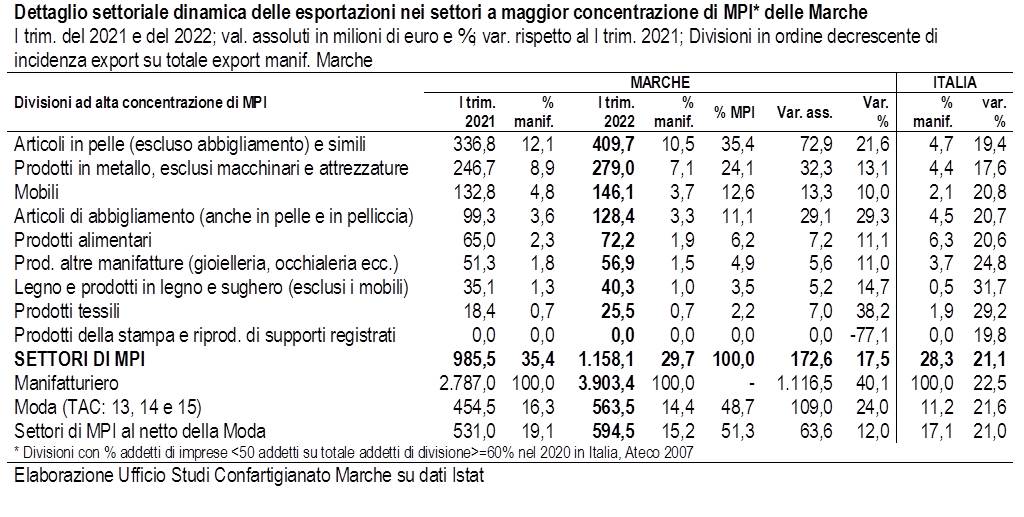 Nel primo trimestre del 2022 nelle Marche le esportazioni dei settori a maggiore concentrazione di micro e piccole imprese (MPI) – alimentare, moda, legno, mobili, metalli, stampa ed altre manifatture (in particolare gioielleria e occhialeria) - sono aumentate del 17,5% rispetto al primo trimestre del 2021, pari a 172,6 milioni di euro in più, dinamica più contenuta rispetto a quella dell’export nazionale di MPI (+21,1%) e all’export manifatturiero della nostra regione (+40,1%). Tra i settori di MPI, sono in aumento nelle Marche tutti i principali settori con un particolare dinamismo del comparto della moda: Articoli in pelle (escluso abbigliamento) e simili registrano un +21,6%, pari a 72,9 milioni di euro in più (era -12,8% nel I trimestre 2021), Articoli di abbigliamento (anche in pelle e pelliccia) aumenta del 29,3%, pari a 29,1 milioni di euro in più (era -2,5% nel I trimestre 2021), e i Prodotti tessili segnano un +38,2%, pari a 7,0 milioni in più (era -11,7% nel I trimestre 2021). Il comparto Moda (Tessile-Abbigliamento-Calzature) nel I trimestre 2022 cresce del 24,0% rispetto al I trimestre 2021 (9° posto in Italia) mentre i settori di MPI al netto della Moda crescono del 12,0% (19° posto in Italia).