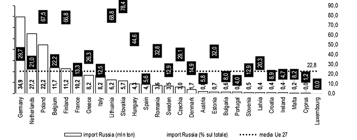 Import di petrolio dalla Russia e peso sul totale import nei paesi dell’Ue a 27