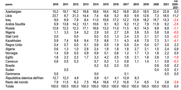 Nel 2021, oltre all’aumento del peso delle forniture libiche, riscontriamo una variazione positiva delle quote di import per il Regno Unito (+2,3 punti rispetto quota del 2020), Algeria (+0,9 punti), Azerbaijan e Norvegia (entrambi con +0,5 punti). All’opposto si registrano riduzioni significative delle quote di Kazakhstan (-4,2 punti) Arabia Saudita (-2,6 punti), Iraq (-2,4 punti), Egitto (-1,8 punti), Canada (-1,7 punti) e Russia (-1,1 punti).