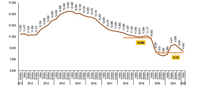 II trimestre 2011 – I trimestre 2022, cumulato ultimi quattro trimestri, dati grezzi – Elaborazione Ufficio Studi Confartigianato su dati Istat
