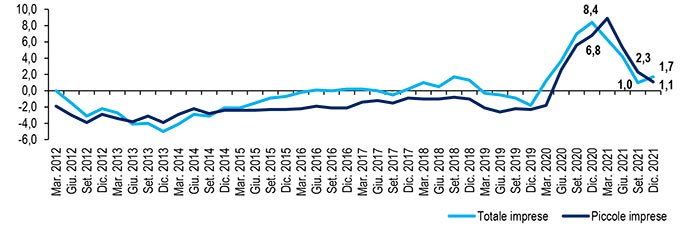 Marzo 2012 (inizio rilevazioni)-dicembre 2021. Variazioni % – Elaborazione Ufficio Studi Confartigianato su dati Banca d’Italia