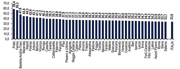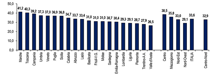 A livello regionale si rileva un peso degli addetti nei settori di offerta di prodotti e servizi tipici del Natale sugli addetti dell’artigianato della regione superiore alla media nelle Marche con il 41,2%, in Toscana con il 40,3%, in Campania con il 39,2%, in Umbria con il 37,3%, in Veneto con il 37,0%, in Puglia con il 36,9%, in Sicilia con il 36,8%, in Calabria con il 34,7% e in Abruzzo con il 33,7%. A livello provinciale, il peso più rilevante dell’artigianato interessato dalla domanda per le festività natalizie si riscontra a Prato (58,4%), Fermo (56,3%), Barletta-Andria-Trani (47,8%), Macerata (44,4%), Napoli (44,3%), Firenze (42,6%), Arezzo (42,1%), Belluno (41,3%), Vicenza (41,2%) e Rovigo (40,2%).