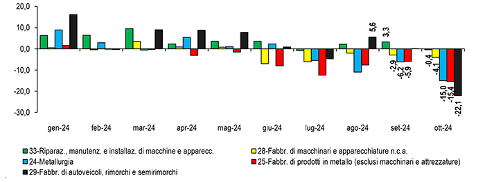 Nei primi nove mesi del 2024 la produzione manifatturiera scende del 3,4%, con cali più pesanti e più ampi della media per i settori della meccanica rappresentati da mezzi trasporto (-9,2%), macchinari e impianti (-4,2%) e metallurgia e metalli (-3,7%).