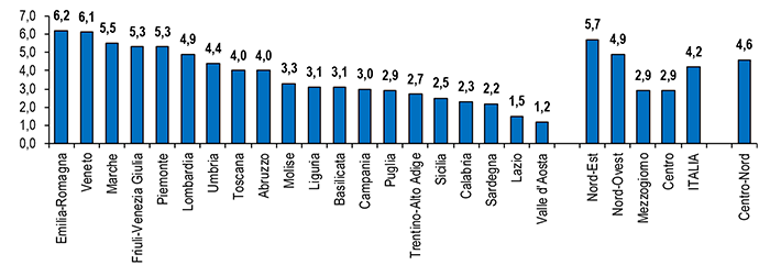 L’esposizione alla crisi della meccanica dei territori – Gli occupati nelle micro e piccole imprese (MPI) della meccanica rappresentano il 4,2% dell’occupazione delle imprese italiane. L’impatto del ciclo sfavorevole del settore può essere più intenso nei territori con una maggiore specializzazione nella produzione meccanica realizzata dalla MPI. In chiave regionale, si osserva un peso dell’occupazione del sistema di piccola impresa della meccanica più elevato della media in Emilia-Romagna con 6,2%, Veneto con 6,1%, Marche con 5,5%, Friuli-Venezia Giulia con 5,3%, Piemonte con 5,3%, Lombardia con 4,9% e Umbria con 4,4%.